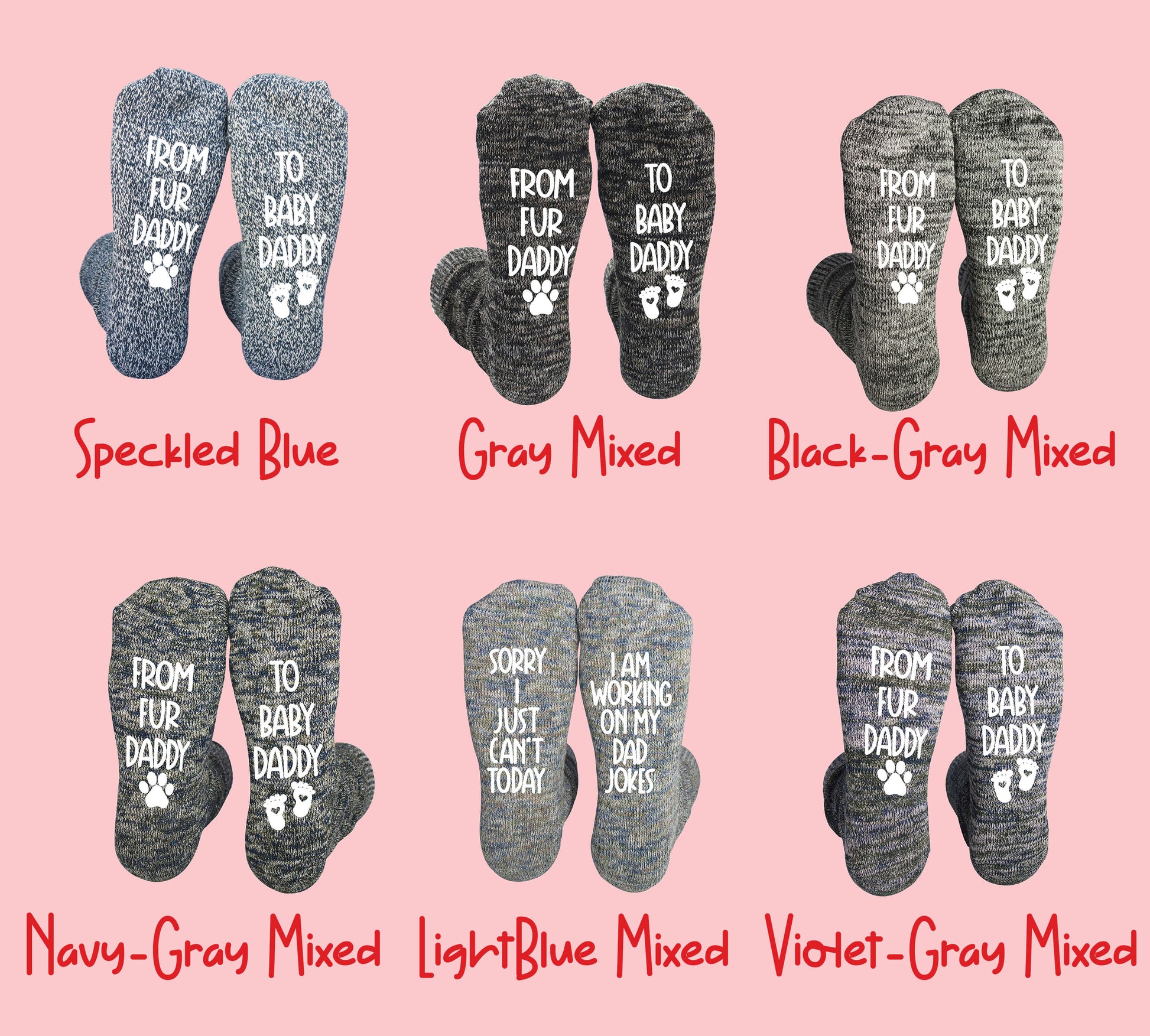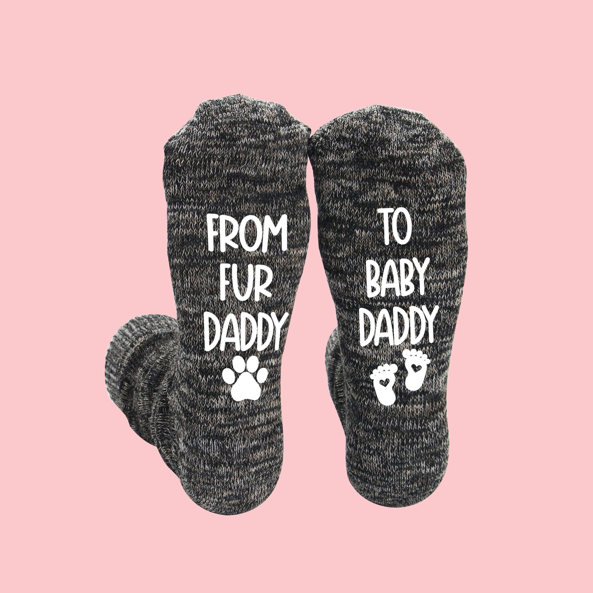 Comfortable and cozy socks for the new parents in your life! Bring a little fashion and fun to new dads! Pregnancy announcements, new dad gifts, baby shower gift for new father, funny pregnancy gifts, and other great choices for soon to be parents! What new parent doesn't want comfy feet! We haven't found any yet! Whether it's for you and your partner, friends, or family that's expecting, this sock makes a great gift! These wool socks keep you looking sharp while bringing a smile to someone’s day. "FROM FUR DADDY...TO BABY DADDY", Funny daddy to be gift with the cute quote, show people you're going to be a dad, celebrate your new adventure. Pregnancy announcement Gift for dad, daddy to be gift, expectant father gift, gift for dad to be.
