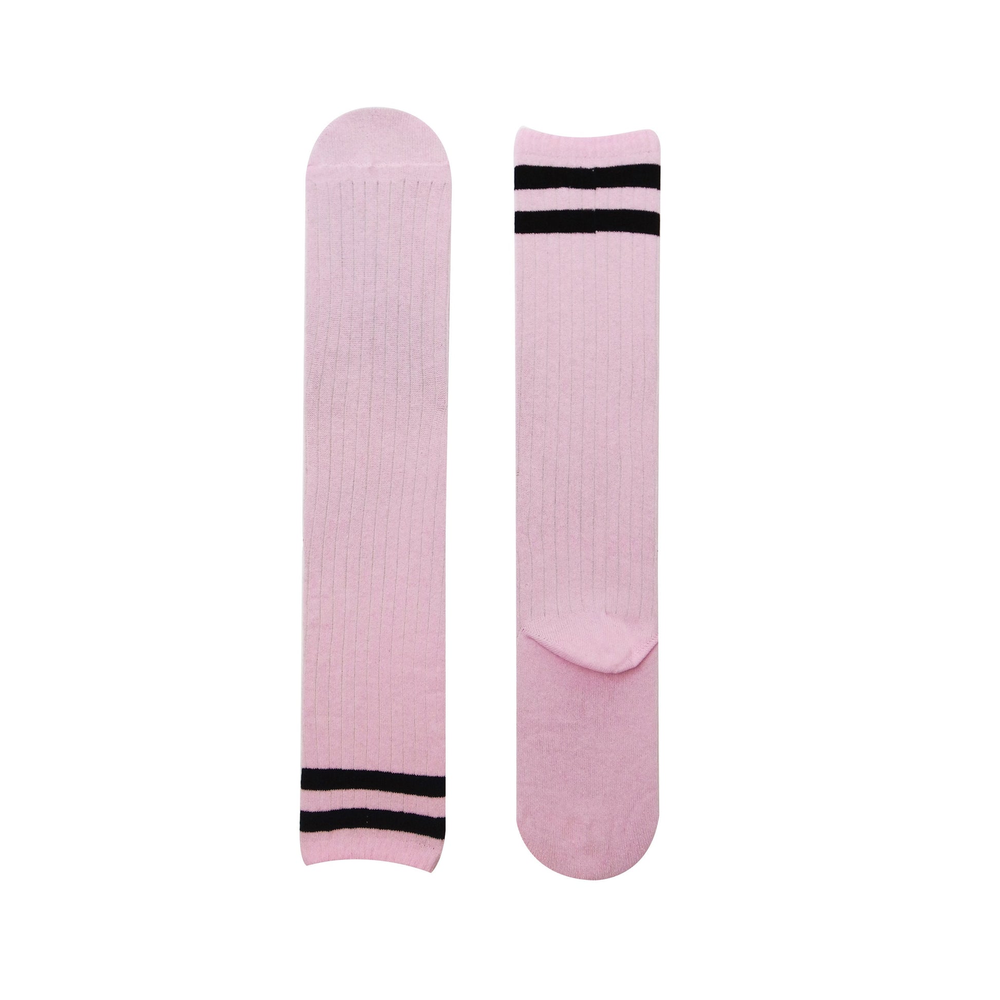 Our knee-high socks come in a captivating shade of pink that adds a burst of color to your ensemble. The bold black stripes running along the length of the socks provide a striking contrast to the pink background. The stripes add a sense of dynamic movement to the design, creating a playful yet sophisticated visual appeal.