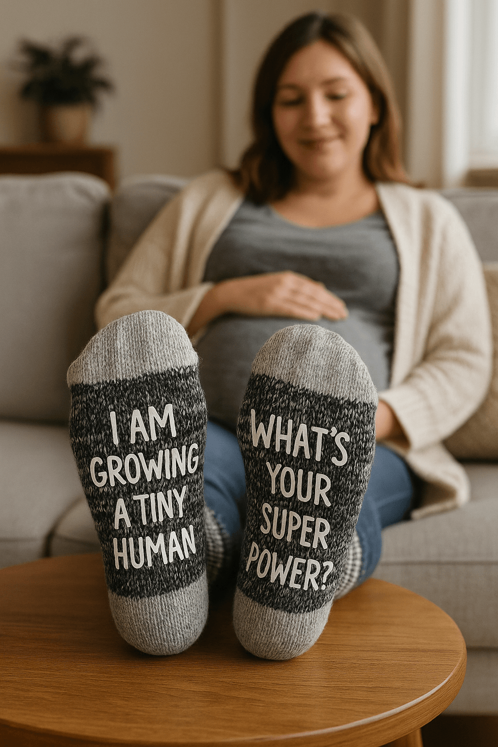 Wearing these socks is not only a delightful way to express your current state but also serves as a gentle reminder to others that you may need a little extra understanding and support during this transformative time. Whether you're lounging at home, attending prenatal classes, or out for a stroll, these socks are the perfect conversation starter and a fun accessory to showcase your incredible journey.