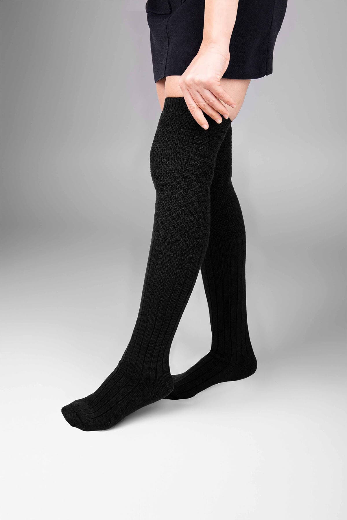 Wrap your legs in cozy comfort and timeless style with our black thigh high socks. Designed with a soft wool blend, they offer the perfect balance of warmth, stretch, and durability. The ribbed knit texture hugs the legs for a flattering fit, while the over-the-knee length adds a chic layered look—perfect for pairing with skirts, dresses, or lounging at home.