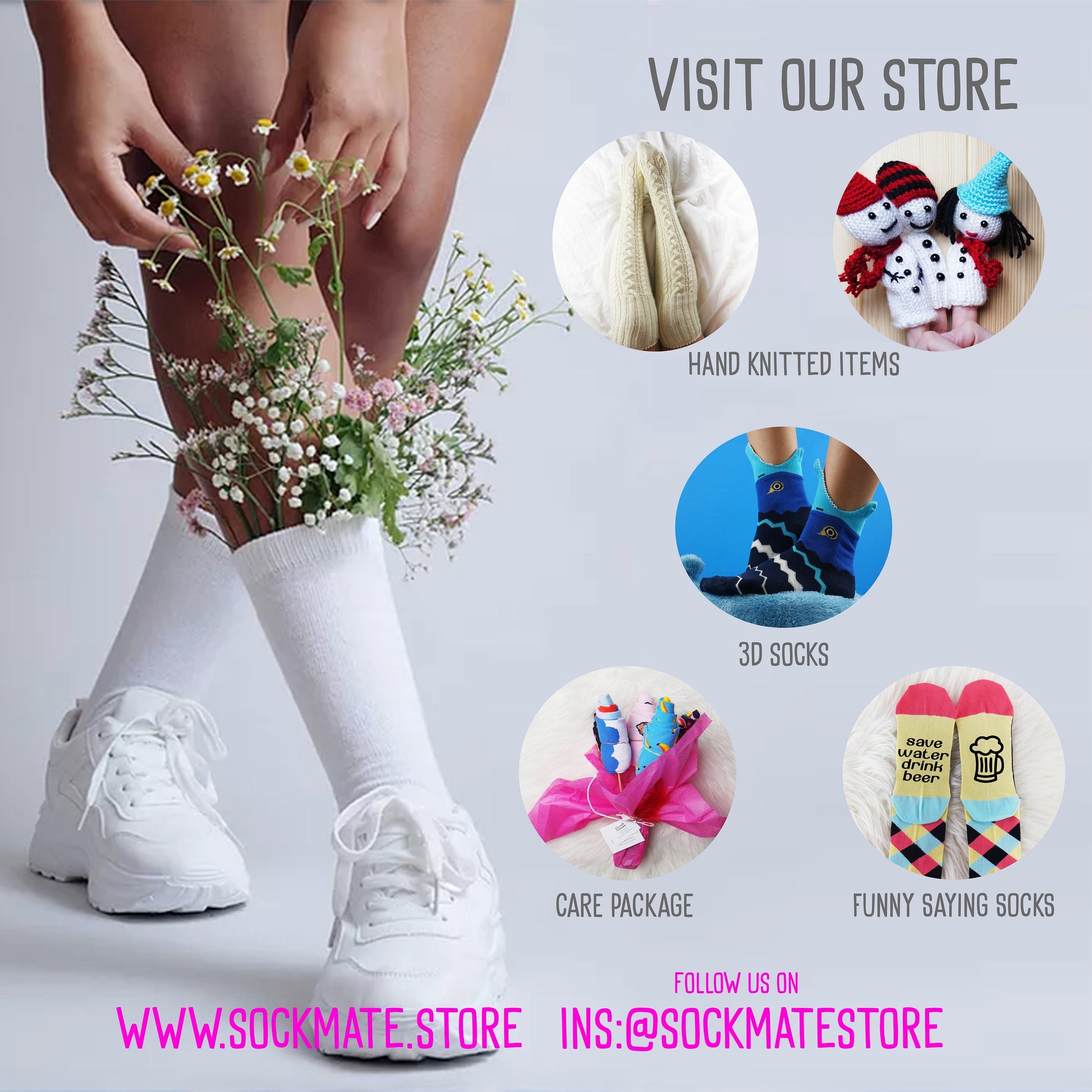 ♥ We have a great collection of men's, women's, kid's socks, 3D accented kid's socks, Thigh-high women's socks and stockings, sock accessories, handmade knitted items, and custom printed socks with fun sayings. Any sock lover should be able to find a great gift at our store!