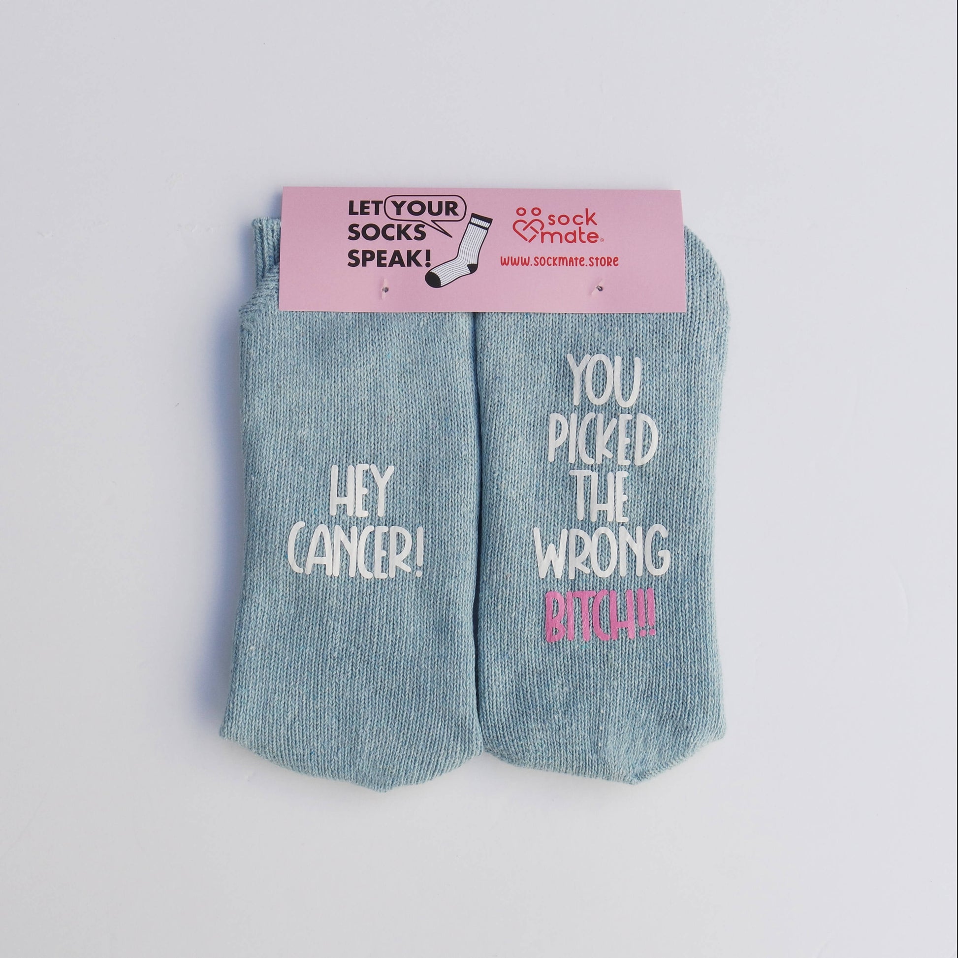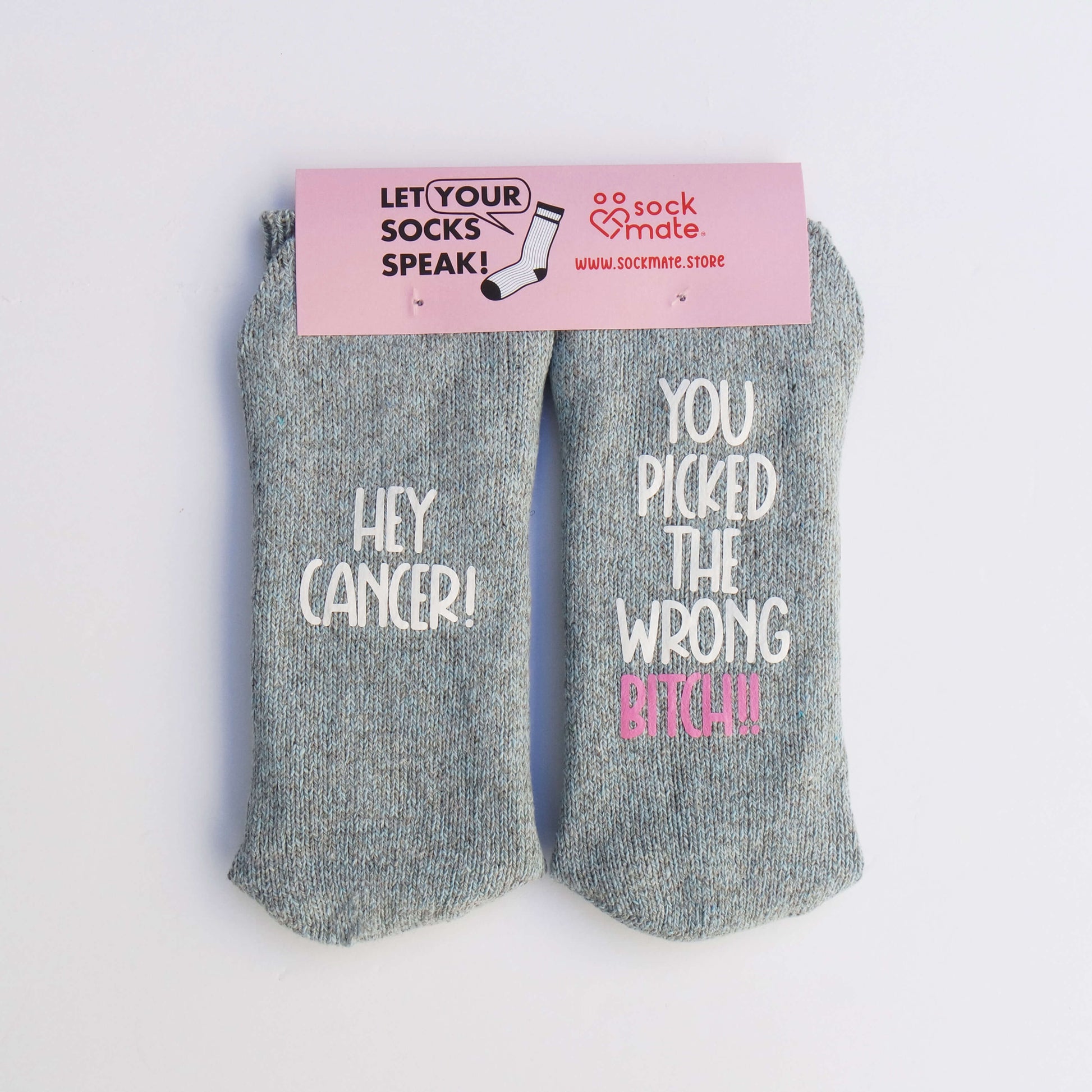 These "Dear Cancer, You Picked the Wrong Bitch" Cancer Socks are the perfect way to show your support for someone who is fighting cancer. This cancer survivor kit contains a heartfelt message about the strength it takes to fight the disease, and serves as a reminder to keep on kicking cancer's ass.
