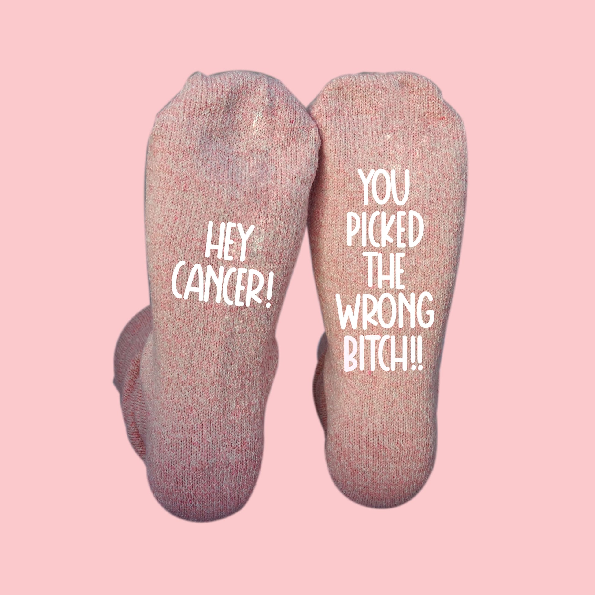 ♥ This listing is for the purchase of 1 pair of "Hey Cancer!" ... "You picked the wrong bitch!!" socks.